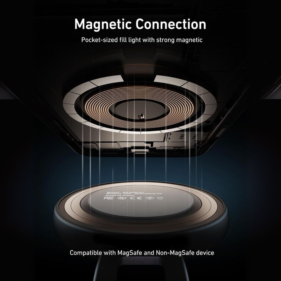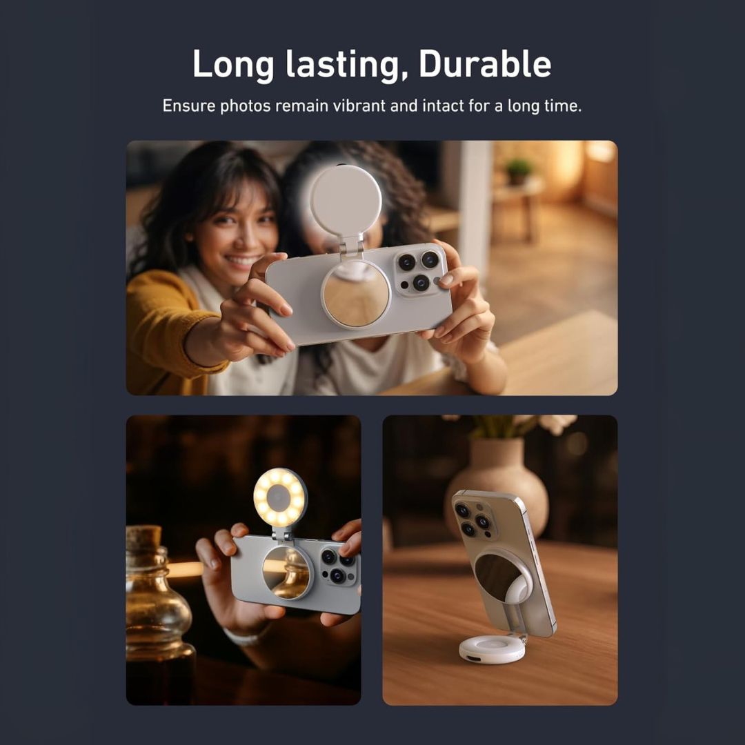 The rechargeable battery provides up to 2 hours of continuous use, perfect for multiple photo sessions or video calls.